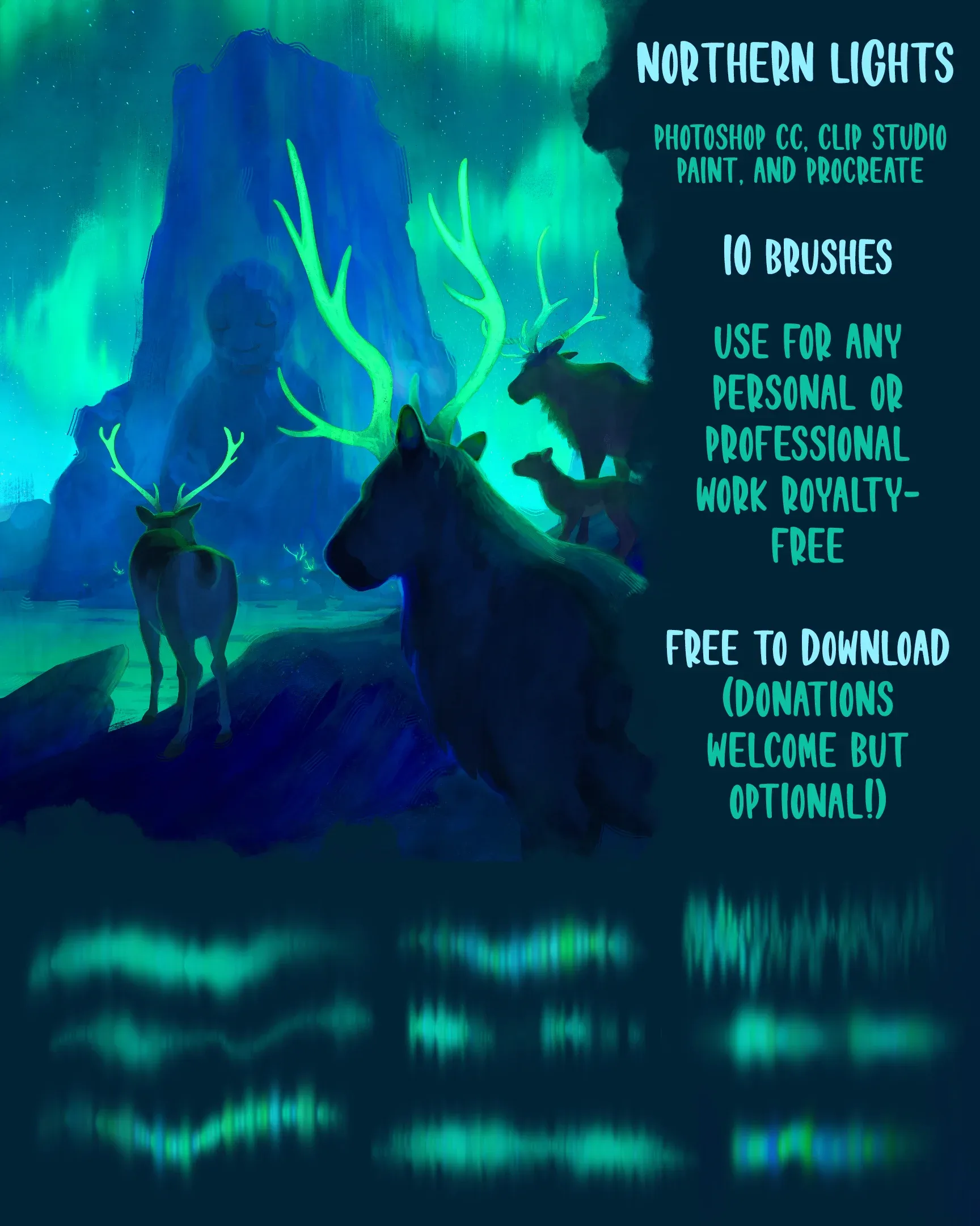 10.) Northern Lights Brush Pack by Devin Elle Kurtz - This gorgeous brush set is perfect for creating a Northern Lights effect in your illustrations. This pack will help you use a glowy airbrush to mimic the shining light of the auroras. Kurtz has tons of other helpful brushes available on their profile so definitely check out their work!