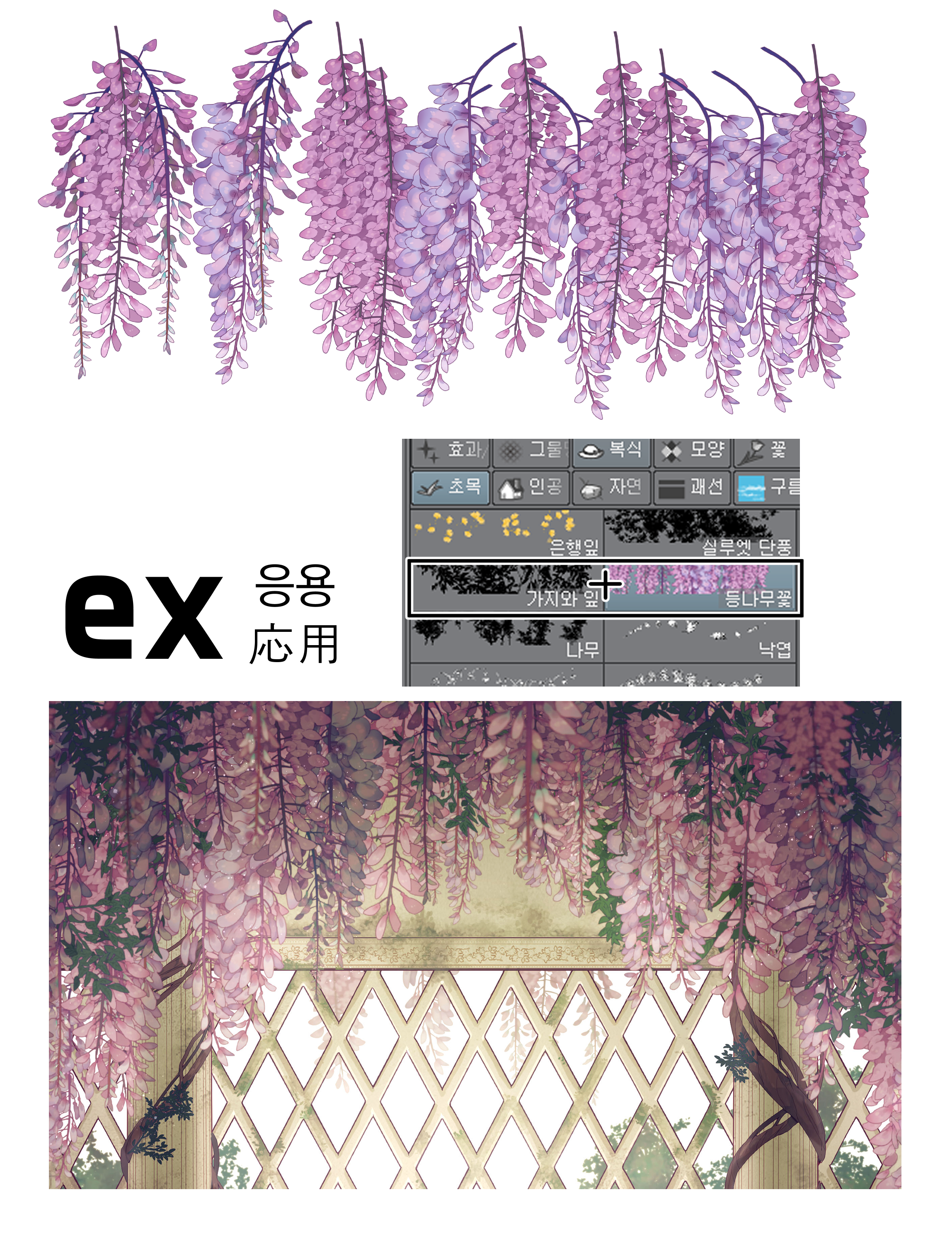 - Wisteria Pack (wisteria) (藤の花(등나무꽃)) by RMMM - There are many wonderful brushes available for drawing foliage and flowers like this one from RMMM. This brush lets you create detailed and beautiful wisteria plants with ease. You could use this brush to create fantastical garden scenes and detailed backgrounds.