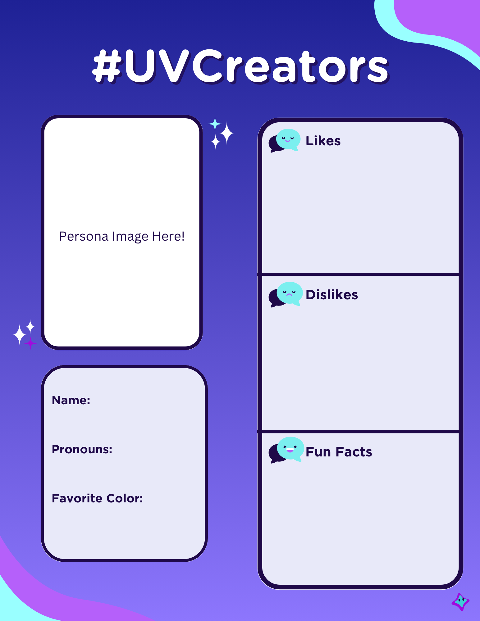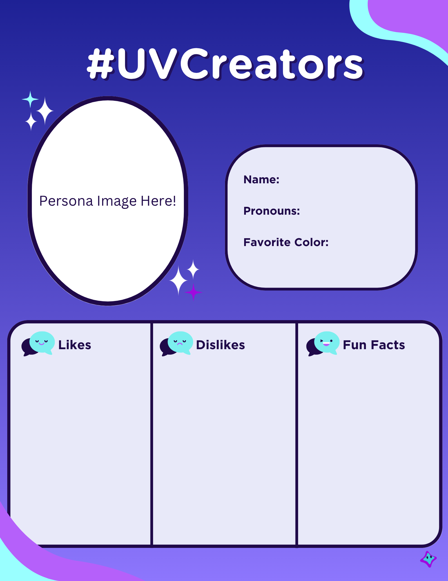 For instance, your preferred pronouns are best placed near your name, while something like your likes and dislikes should be organized in a list. It can be confusing for the reader if information is too scattered around the page. Pride flags can be neatly organized into a line, or maybe placed around your name like stickers! As long as similar information is nearby, anything goes.