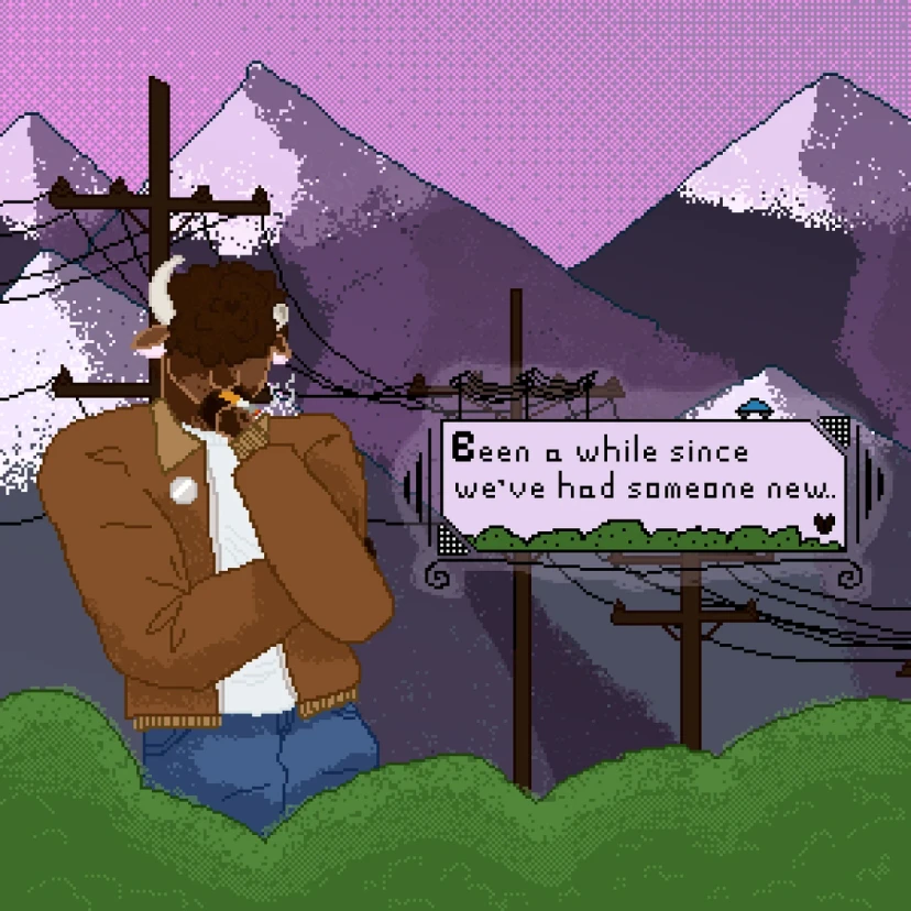 Art of “Raymond” by HeyoItsRaleo. The character is a bison anthro in a brown jacket and jeans by a billboard that says “Been a while since we’ve had someone new…”