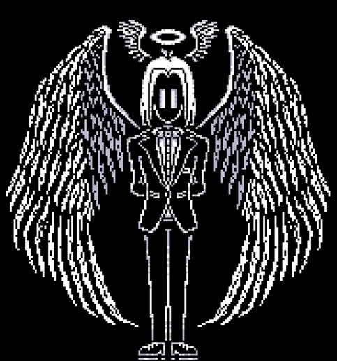Art of “🤍Seraphiel🤍” by Lyon328. The character has long white hair, large angel wings on their back, smaller ones on their head, a halo, and a tuxedo.