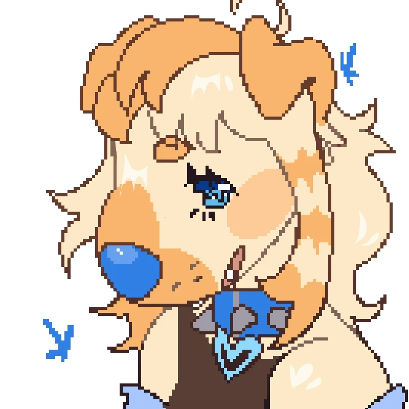 Art of “Vanilla Wafer” by strangebirdie. It is a pixel headshot of a blonde dog fursona with blue eyes, a blue nose and a blue collar.