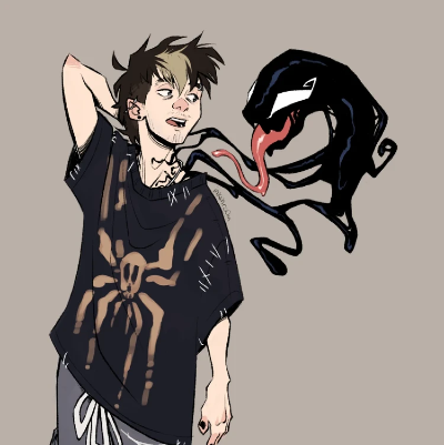 Art of Spink. He is a pale adult with brown hair that had a blonde tuft, light facial hair, and alternative clothing and accessories. They are talking to a venom symbiote that is attached to them.