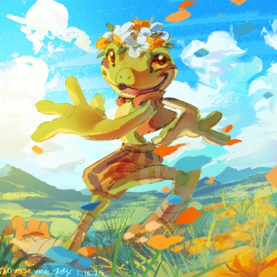 Odysseyre’s character “Nivii The Frog.” She is an anthropomorphic frog in a vest, pants, and bandaged feet. She’s wearing a flower crown and smiling wide.