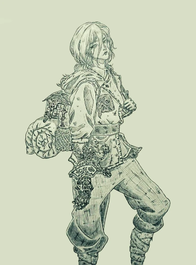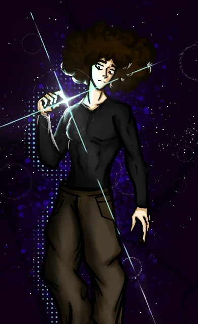 Art of Jude Reneke. He has a fair complexion, dark brown eyes and hair, and a black long-sleeve shirt with brown pants. He is forming bright energy between his fingers and leaning away from it.