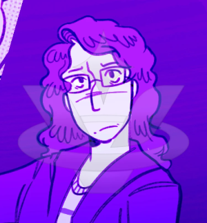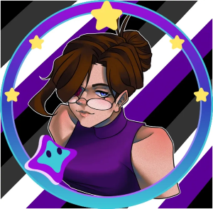 Profile pic of BeccaBunny215. It is a headshot of a feminine person with pale skin, long brown hair in a bun, blue eyes, glasses, and a purple turtleneck with no sleeves. They have an Unvale Super Star frame and the background is the asexual pride flag.