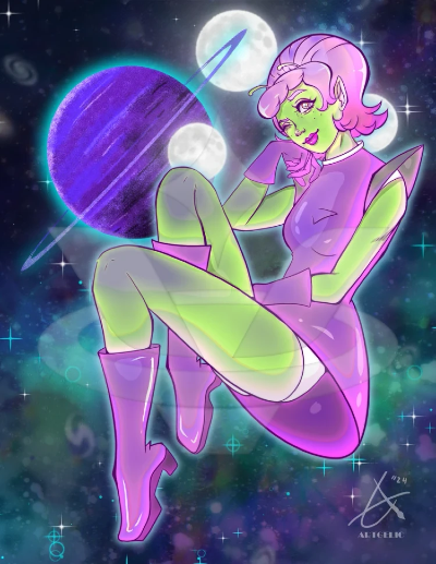 Art of Zasra Stargazer. They have green skin, a short pink dress, pink go-go boots and pink hair. She’s winking at the camera and lifting her chin on the back of her hand.