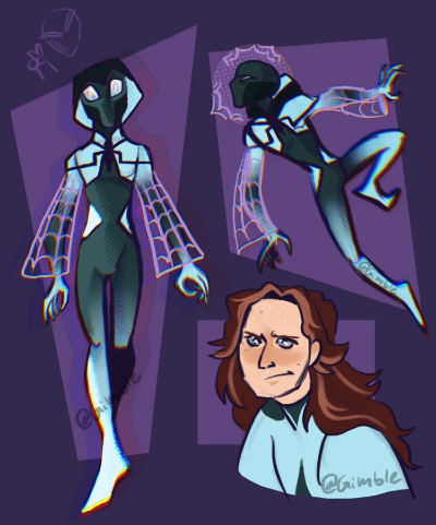 Art from “Finally! A Spidersona!” Gimble’s spidersona has a black suit that fades into a light blue-gray, with purple web long sleeves that go over the arms of the suit.