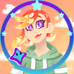 Profile pic of solarsunrise. It is a headshot of her persona, which has pale skin, purple eyes, orange and yellow splatoon-like squid hair, and a green hoodie.