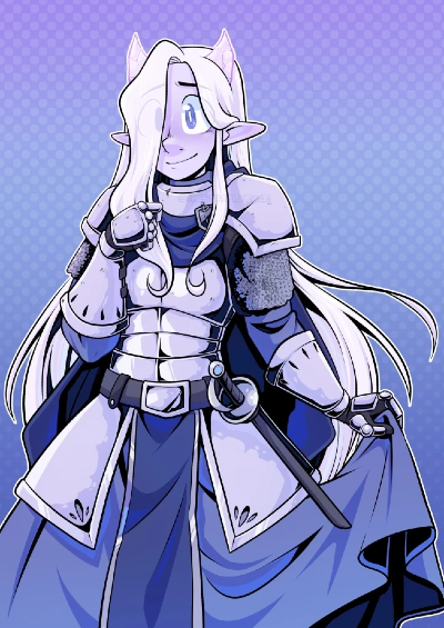 Art of Verity Noblesse. She is a tiefling with light violet skin, white hair, blue eyes, horns, and knight armor with a blue dress underneath. She has a kind, bashful expression.