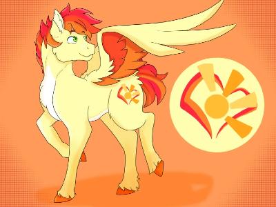 Art of Solar Flare. He is a pegasus with a pastel yellow coat and a red and orange mane. His cutie mark is a red and orange heart with a sun shining through it.