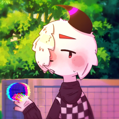 JustSomeone’s persona, “Zander.” He is a demon with white fur, red eyes, and a horn with a glowing stripe. He’s wearing a black hoodie with a white checker pattern and manipulating power with his lifted hand.