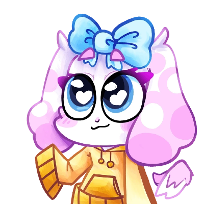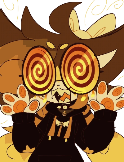 Keegamonsters’ character “Spiral.” They are a nanocat with white-yellow fur, brown hair, a black hoodie, orange toe beans, and opaque glasses with yellow and brown swirls.