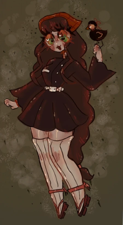 Art of Ayuki Chisaki. She has brown hair almost as long as she is tall, orange and green eyes, an orange bandana in her hair, and a cheerful demeanor. She is wearing a standard demon slayer uniform with a black skirt and long socks.
