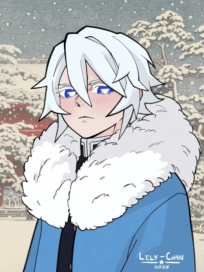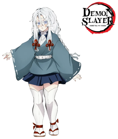 Art of Kagesaki Ritsu. She has long white hair in twin braids, pale blue eyes, and pale skin. She’s wearing a blue robe over a demon slayer uniform top and skirt.