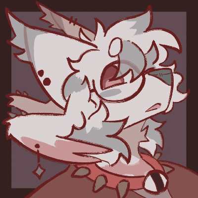 OpeningWithZugzwang’s character “Calrix Solven.” They are a light gray wolf with darker patches in their hair, pastel red eyes, wings coming out of their temples, glasses, and piercings.