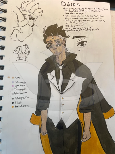 Art of Dàinn. He has brown hair that is graying, yellow eyes with skull-shaped pupils, tan skin, and sunglasses. He’s wearing a black suit with a white vest and a black cloak with yellow fabric on the underside.
