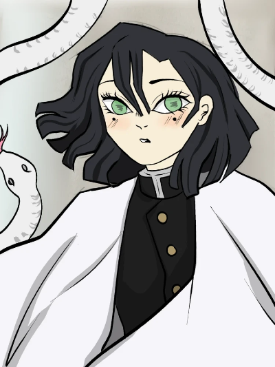 Art of Emiri. She has neck-length black hair, green eyes with black dots under them, and a white robe over her uniform. She is accompanied by a white snake.