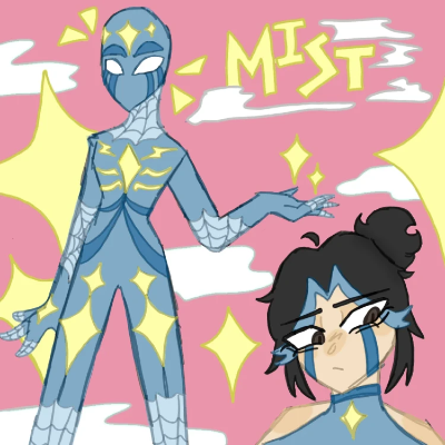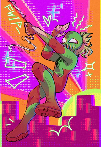 Art of Spider Mantis. They have a green spider-suit with red knees, boots, elbows, gloves and sides. Blonde and green hair is tied back on the outside of their mask.