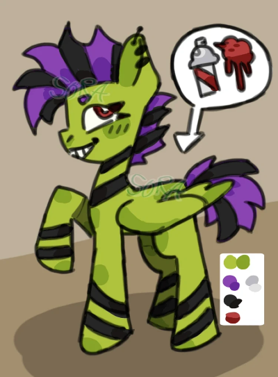 Art of Sour Splatters. She is a green half-zebra, half pony with red eyes, black stripes, a purple and green mane and tale, and a red spraypaint can cutie mark.