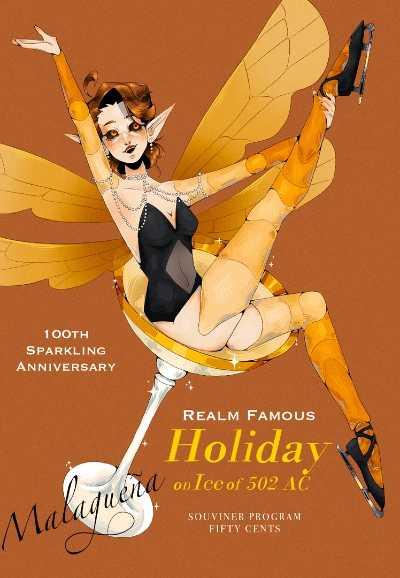 Art of Aurette “Malagueña.” They are a fairy with pale skin and yellow exoskeleton limbs, yellow eyes, long light brown hair and yellow wings. They’re sitting in a martini glass and posing with their limbs held out.