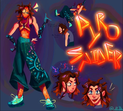 Art of Pyro-Spider. Their spider suit is sleeveless red and orange, and they are wearing dark teal and bright turquoise sweatpants and shoes. Their brown hair comes out of the mask, tied half-up.