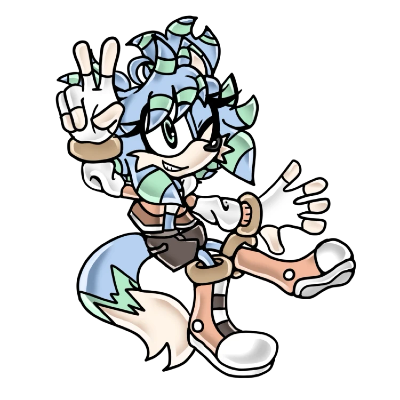 Art of Luna The Hybrid. She has blue and green fur, green eyes, and an orange and white jacket and boots. They are winking at the viewer and giving a peace-sign to the camera while balancing on one foot.