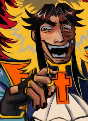 Profile pic of mephistophyles. It is a headshot of their oc “Father Mikaela Crowe,” who has multi-layered hair of yellow and brown, a maniacal expression of laughter, and a blue and orange suit.