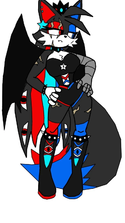 Art of Nightmare The Hellfox. She has black and white fur white red and blue accents, red and blue heterochromia eyes, and black alternative clothing with red and blue details throughout.