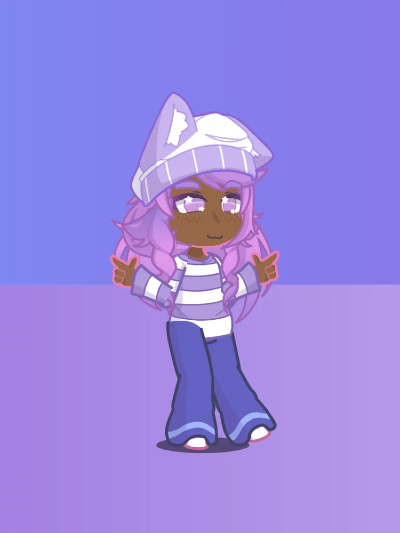 Art of Lilac. She has brown skin, purple and pink hair, purple eyes, and freckles. She is wearing a purple and white striped shirt, a white and violet cat ear beanie, and blue jeans.