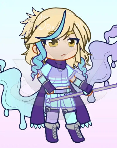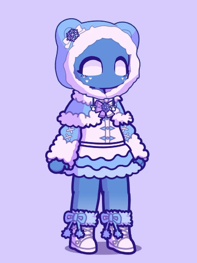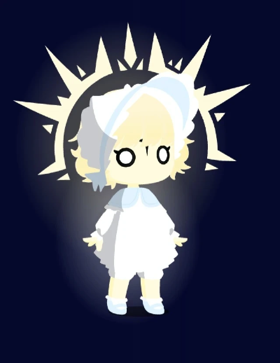 Art of Star. She has a white and baby blue dress, shoes, and a bonnet. She also has short blonde hair and a halo, as well as bright light emanating off of her.