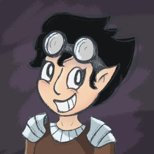 Profile pic of Oboegirl85. It is a headshot of a pale person with elven ears, short pointy black hair, gray eyes, and goggles lifted to their forehead.