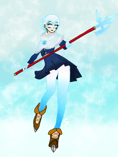 Art of Yukina Shirayuki. She has white hair in a bun, ice blue eyes, a shoulder coat over her uniform and snow-patterned tights with brown ice skate boots.