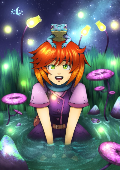 Art of Gamma. He has red, orange and yellow hair; green eyes; and pale skin. He is sitting in a pond with fireflies surrounding him and there is a frog on his head.