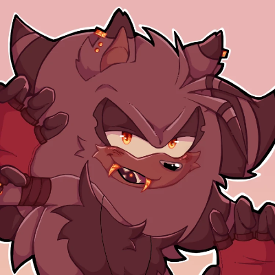 Art of Scamper. He has brown fur and quills, yellow-orange eyes, gold fangs and red gloves. He’s smirking at the camera and holding his hands up in claws.