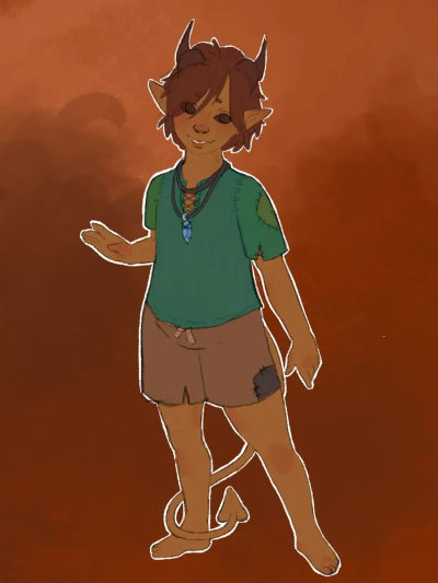 Art of Nephremir Mormos by Nephremir. He is a tiefling with orange skin, brown hair, fully brown eyes, pointed ears, horns, and a tail. He is wearing patched-together clothing and a crystal necklace.