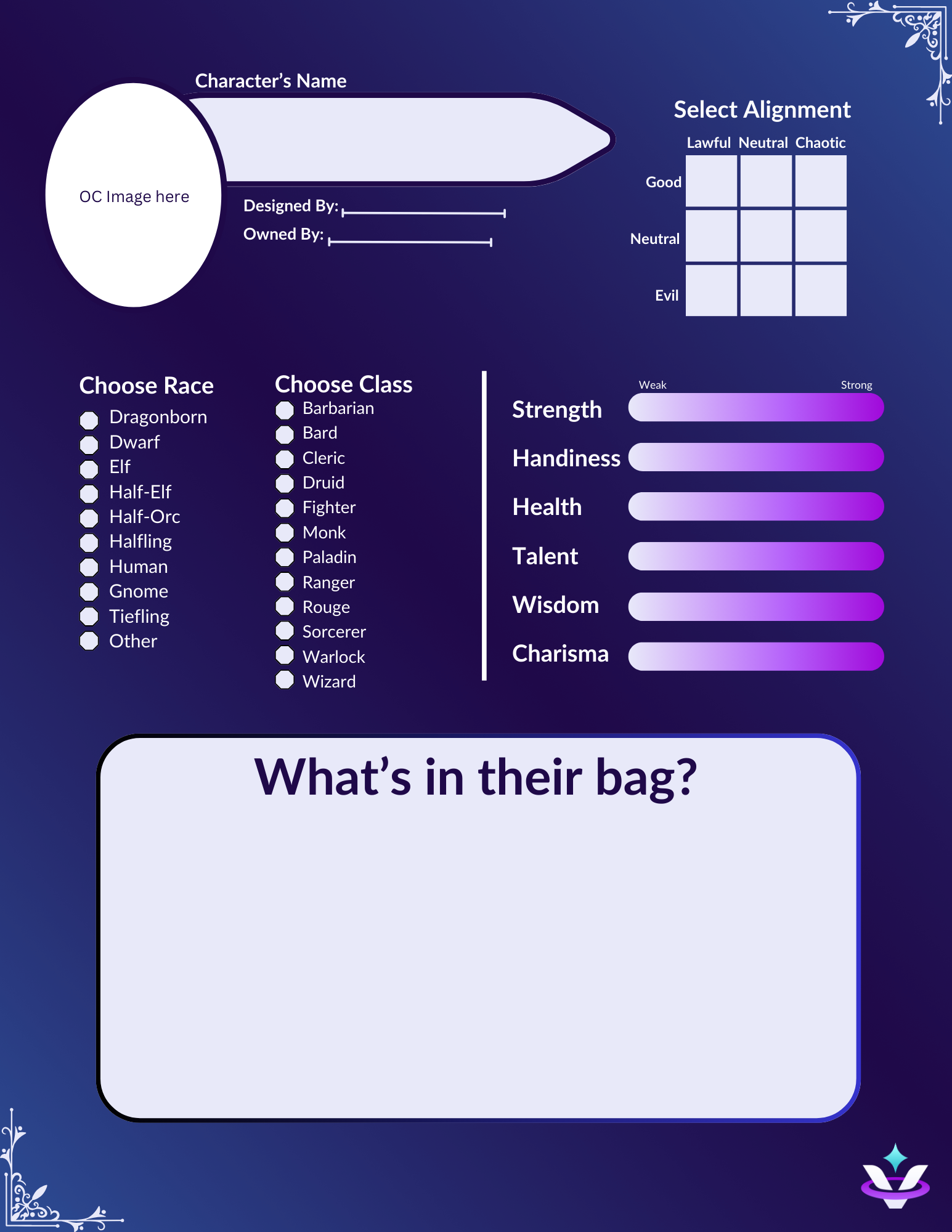 - If character sheets arenāt your thing, feel free to write a story of your OC as a TTRPG character or draw a new piece of art inspired by their class!